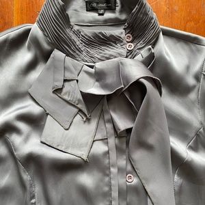 Beautiful slate grey silk button-up. Gorgeous under a blazer or by itself. I used it two for photoshoots. Very flattering tailored shape.