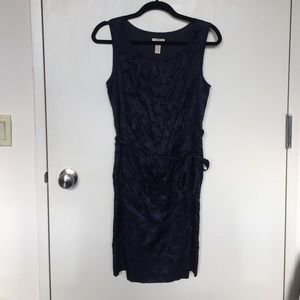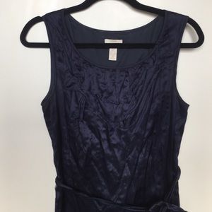 Silk cotton with metal that gives fabric a crinkle. Navy sheath cocktail dress with ruffle front detail and self belt.
