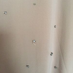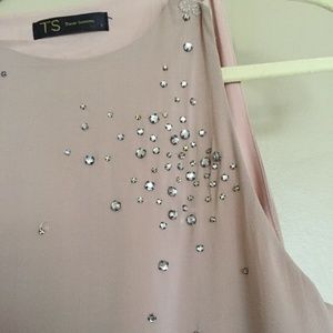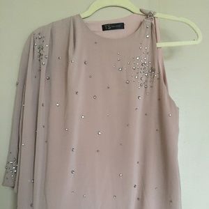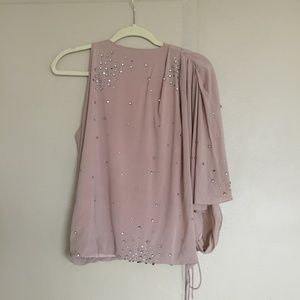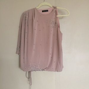 100% Silk embellished one-shoulder blouse with rhinestones.
