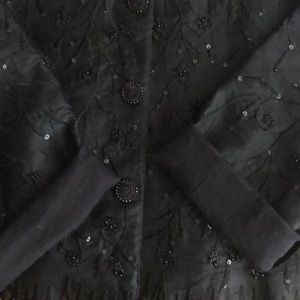 100% Silk Jacket made in India featuring embroidery, beads & sequins. Lined & lightweight. Dressy but casual paired with black jeans!
