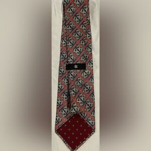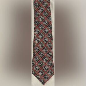 Silk neck tie with beautiful red gold and blue print. It is an eyecatcher!