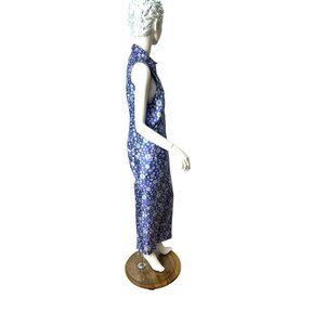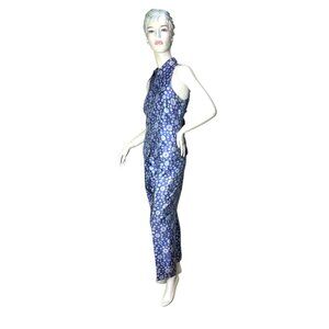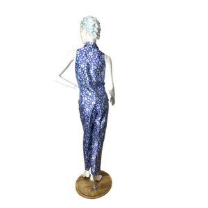 Very pretty silk brocade pant set in periwinkle blue with wimsical circles and flowers. The top buttons up the front with small pearly buttons. It is slightly fitted. Lined with silk. The pants have a tapered leg, flat front and side zipper. They are fully lined with silk. Size 8. Very good condition.