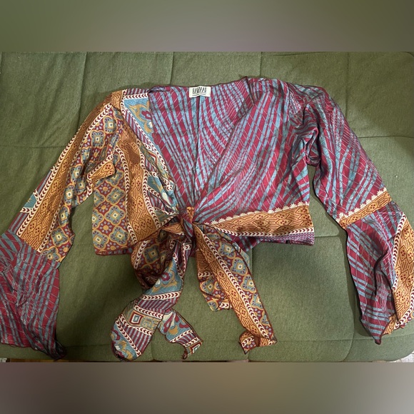 Silk patchwork tie top with bell sleeves. I bought this from a market and sadly it’s a little bit too small. Would best fit a small or extra small.