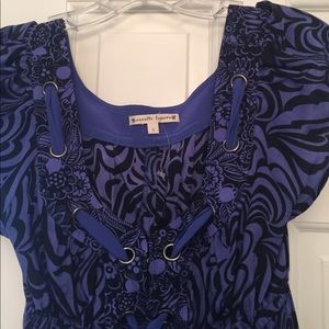 Printed silk top with grommet detail and tie at front. Elastic under bust and slight shirting at shoulder