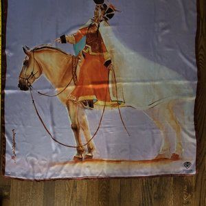 Mongolia made silk scarf. Woman in traditional clothing on a horse