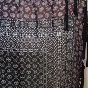 Navy and plum foulard printed square silk scarf with black fringe. Never worn