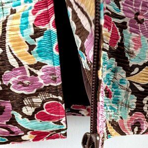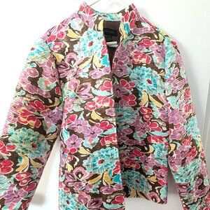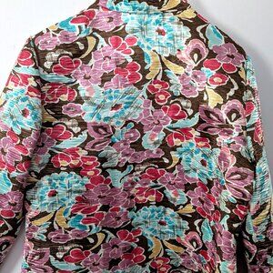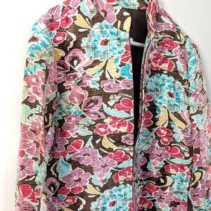 Beautiful SILKLAND women’s button-front jacket featuring a vibrant multicolored floral print with fully lined brown color. Full front brown zipper and jacket