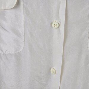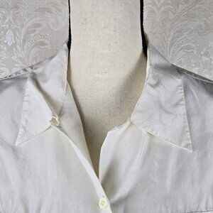 Cream colored 100% silk shirt has a button up front and traditional shirt collar. Two flap pockets on the chest. Long sleeves with button at the cuff. Slightly longer hem in the back. Easy to dress up or down.