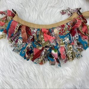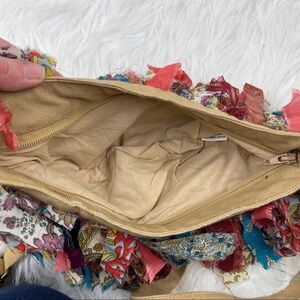 Multicolor and multiprint ribbon handbag. Body of purse is covered in silk ribbons with nylon/rayon blend strap and interior. Strap is adjustable and tan hardware. Purse is small- great for a casual day or night. Some ribbons have frayed and minimal marks on bag. Fraying is not noticeable. Length 6”, width 12”, drop 23”. Beautiful!