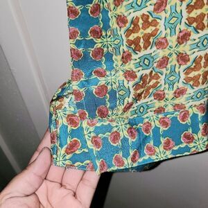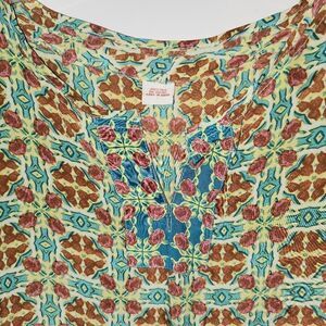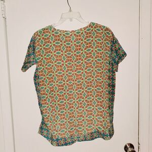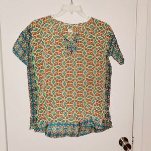 Beautiful, short sleeve, lightweight top. It has no brand tag,but it does say 100% Silk. Size it's XS, but it's oversized. Please refer to measurements for best fit before buying. Pre-owned in great condition.