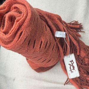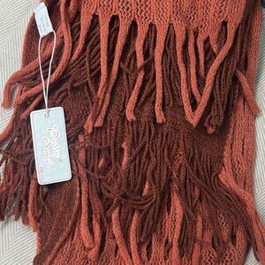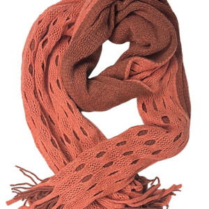 Cozy and stylish knit scarf in a warm coral and brown hue. Perfect for layering.