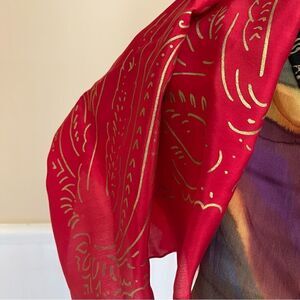 The Honey Scarf Still Has A Gold Tone Signature Charm Attached. Scarf Is Red With A Abstract Gold Pattern
