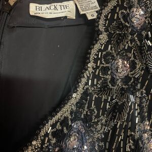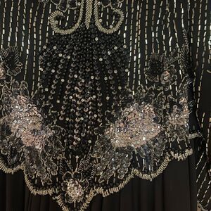 This exquisite gown features a beautifully embellished bodice with intricate silver and gray beading, complemented by long sleeves. The flowing pleated skirt adds a touch of elegance, making it perfect for cocktail parties or as a wedding guest attire. The V-neckline enhances its sophisticated silhouette.