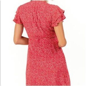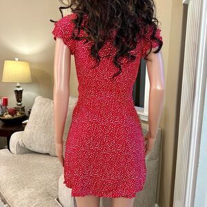 Chic and stylish red wrap dress with playful polka dots. Perfect for any occasion. Flutter sleeves. Does need a tad bit of ironing along bottom front and back.