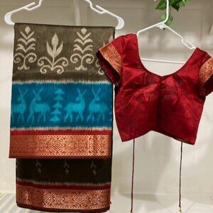 The sari is multi-colored - greenish grey, turquoise, and red, with gold border embroidery. Brand new. The blouse is medium in size.
