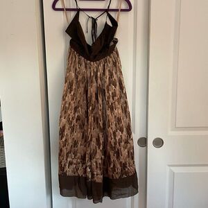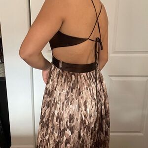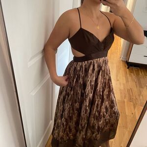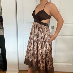 Descriptions: 100% silk brown cutout top dress, strappy back tie detail, lined skirt with print, size zipper, so pretty and sexy. I love this for the upcoming holidays