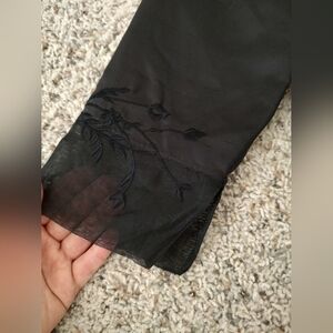 Elegant black button-up dress with intricate embroidery on the sleeves and hem. Perfect for any occasion.