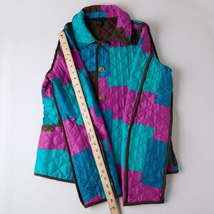 This unique Silkland reversible quilted jacket offers two stylish looks in one! One side features a bold multicolor patchwork design in shades of blue, purple, and brown, while the other side is a sleek solid brown with classic gold-tone buttons. Made from luxurious silk, this lightweight yet warm jacket is perfect for layering and transitional weather. Ideal for eclectic, boho, and statement fashion lovers, this piece is both eye-catching and versatile.