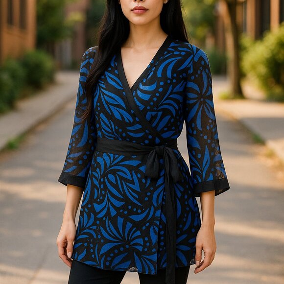 This wrap blouse features a lightweight silk shell with a vibrant black and blue pattern, offering both style and comfort. Ideal for professional settings.