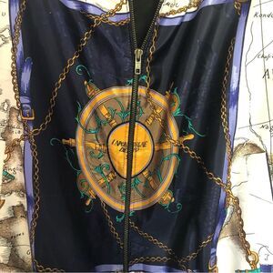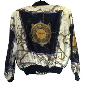 Cream and navy blue vintage full zip boxy fit jacket from Silkworm's. All over nautical and map print. Ribbed knit cuffs, collar, and hem. Lightweight with pockets and shoulder pads. Some discoloration due to age, especially on the shoudlers from the shoulder pads (shown in photos).
