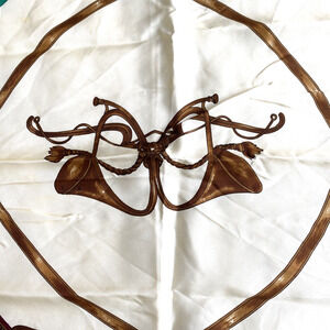 Silky square scarf in an elegant couture designer look - carriages buggies and hunting horns motif - navy blue, golden yellows, and cream colors make for a classic career look. No tags but this feels like a silky polyester blend fabric in a wonderful size for many uses. No damage or flaws - excellent pre-owned condition.