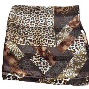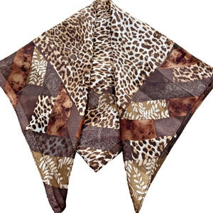 Silky Animal Print Scarf - a smaller sized square fashion bandana or neckerchief done in a satin finish - probably polyester or a polyester blend - with machine finished edges and a burnout stripes finish. The traditional colors include browns, tans and cream in an all over patchwork pattern of various animal prints. No tags or hallmarks - nice fashion quality - in excellent pre-owned condition with no flaws. Classic and very cute!
