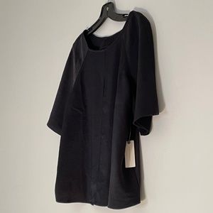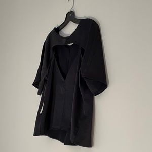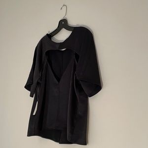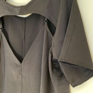 An adorable versatile top with a surprising cutout rear cami look in a silky polyester material. Semi boxy swing fit…You can size down but only if you’re small breasted IMO.