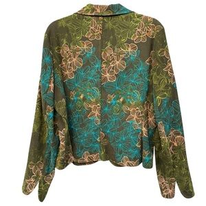 Elevate your wardrobe with this lightweight silky-feel floral blazer. The bold botanical print pops in teal, peach, and green on a deep olive background. Flowy and soft with a structured shape, it features a notched collar and front buttons. No tags, but fits like a women’s M/L.