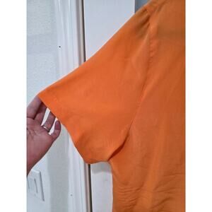 Unbranded silky-feel orange blouse with a short sleeve, crew neckline, and elegant keyhole back button closure. Lightweight and fluid with a minimalist design that works great for workwear, capsule wardrobes, or spring/summer outfits.