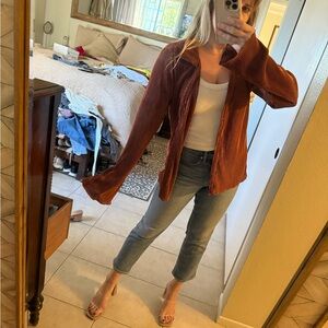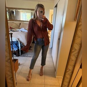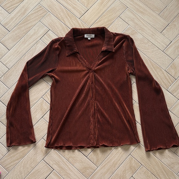 Chic rust blouse with ribbed texture. Features a classic collar and button-down front. Long sleeves for versatile styling. Super fun to wear. Flowy and silky. Worn twice
