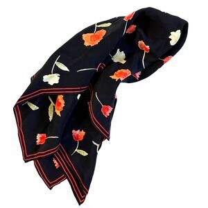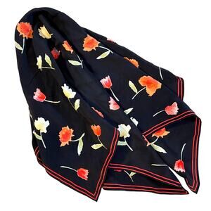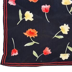Silky Scarf in Black & Multicolor floral design - a small square neckerchief style with wonderful colorful red green yellow flowers all over. No tags but this feels like silk or a silky blend fabric - nice size for bag tie / wrist wrap / neck tie. No apparent flaws - so cute!