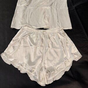 Soft satin 2-piece set with button-up short sleeve top and elastic waist ruffle shorts.