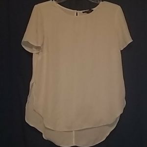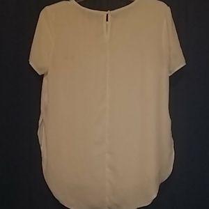 White sheer silky blouse. Short sleeve. Sweetheart neckline. Rounded hem with slit sides.