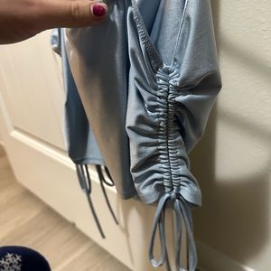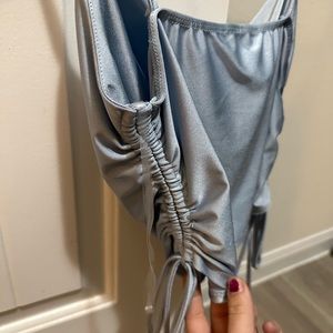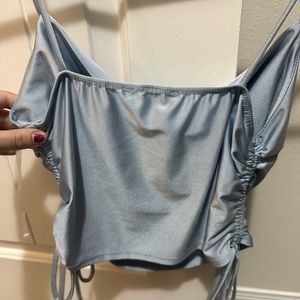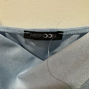 This beautiful strap he silver blue shirt has never been worn, as it has not been put to the proper use. Hoping one of you lovely ladies can wear it as I never did has to bows on the side which will help the shirt scrunch up as much as you’d like.