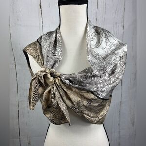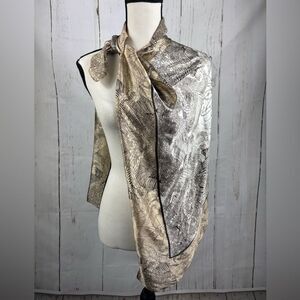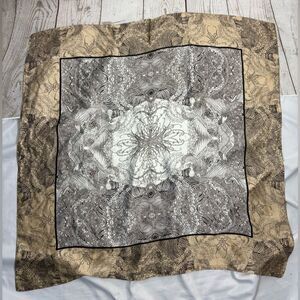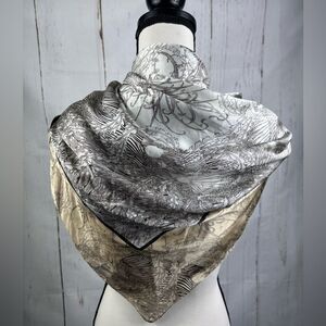 Silky Satin Beige Brown Scarf Square Printed Birds Botanical Abstract