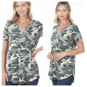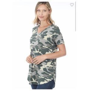 Very comfy everyday tee in camo. Rounded hemline, v-neck and short sleeve