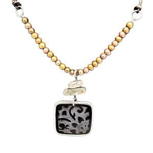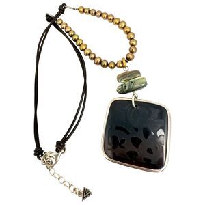 Add a touch of artisan elegance to your jewelry collection with this stunning Silpada N1803 necklace. Crafted with genuine 925 sterling silver, brass accents, and freshwater pearls, it features a carved abalone and black resin pendant that brings a unique boho-chic vibe. The necklace is finished with a comfortable leather cord and secure clasp.
