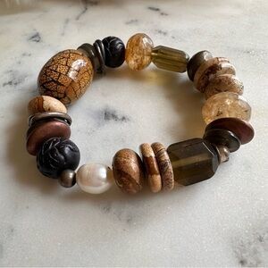 •Earthy Color Stretch Bead Bracelet with Jasper, Bronze, Brass, Glass, Carved Bone, Pearl, Sterling Silver & Bamboo
