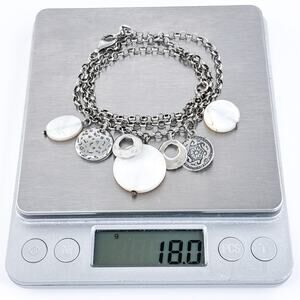 This vintage Silpada sterling silver necklace from Israel features an array of textured charms and luminous mother of pearl discs on an adjustable chain. The layered design adds a boho-chic vibe, perfect for adding eye-catching detail to any outfit.