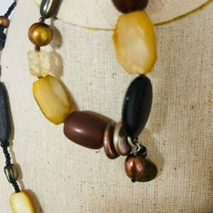 Catalog description: "Enjoy the earthy hues of this Shell, synthetic Horn, Seed Bead, Black Glass, Freshwater Pearl, Brass, Sterling Silver and Glass Bracelet. Fits up to a 7 1/2" wrist and has an adjustable Toggle Clasp."