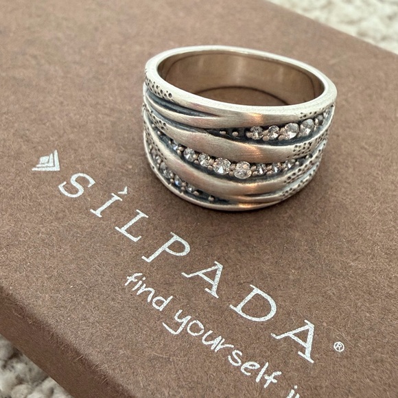 Stylish Silpada ring with a textured silver band and cubic zirconia. Size 7.75. Excellent used condition, does not show wear.