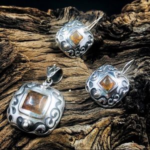 Silpada Retired Amber and Sterling Silver Etched Square Earrings and Pendant Set