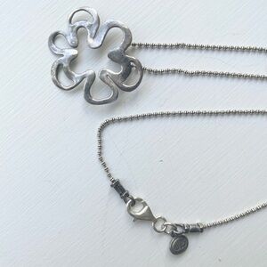 The Silpada Sterling Silver Necklace showcases a flower-shaped pendant with minimalist open-work appeal. Hand Crafted of .925 silver & slightly oxidized, this necklace features a delicate chain that complements the pendant's contemporary floral motif. Fun & versatile. Authentic Silpada, .925 & logo stamp.