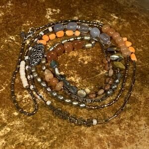 The Silpada Spice Box Necklace is a stunning piece of handcrafted jewelry that features a variety of colorful gemstones, pearls, and beads strung on a 50-inch long chain. Made of sterling silver and copper, this statement necklace is signed by the brand Silpada and has a lobster closure. The main stone colors include brown, orange, and abalone, adding a vibrant touch to any outfit. Perfect for women who appreciate unique and artisan jewelry pieces. Silpada hallmark and 925.