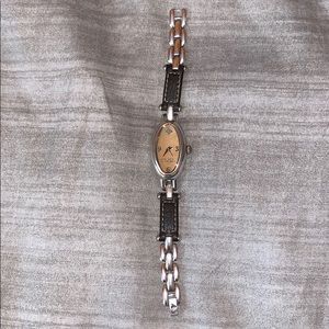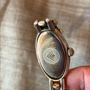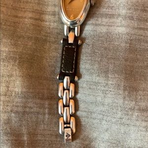 Stainless steel back, water resistant, brown leather partial band. Fits loose like a bracelet. Great condition.