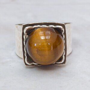 A 12 mm tiger’s-eye sphere sits on a stepped square platform above a hammered sterling band. The wide shank gives it presence; the orb brings that silky cat’s-eye glow Silpada collectors love. Hallmarked with the Silpada logo and 925.
