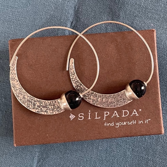 Retired Silpada circular oxidized/hammered .925 Sterling Silver earrings featuring a droplet of Chalcedony with thread through thin wires. Approximately 2 inches in diameter. Excellent condition!