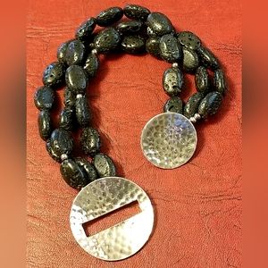 B1511 Black Lava and Sterling Silver Beads are joined together by a unique, hammered Sterling Silver button closure. Fits up to 7" wrist.