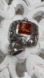• The amber is bezel-set in a substantial sterling silver frame, accented with raised swirls and oxidized detailing for contrast.