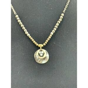 The necklace is part chain and part bead. The Pendant features 3 Cubic Zirconia inlaid in Pyrite with a Silver disc behind. Adjustable length from 16-18". A great piece to wear with any outfit.